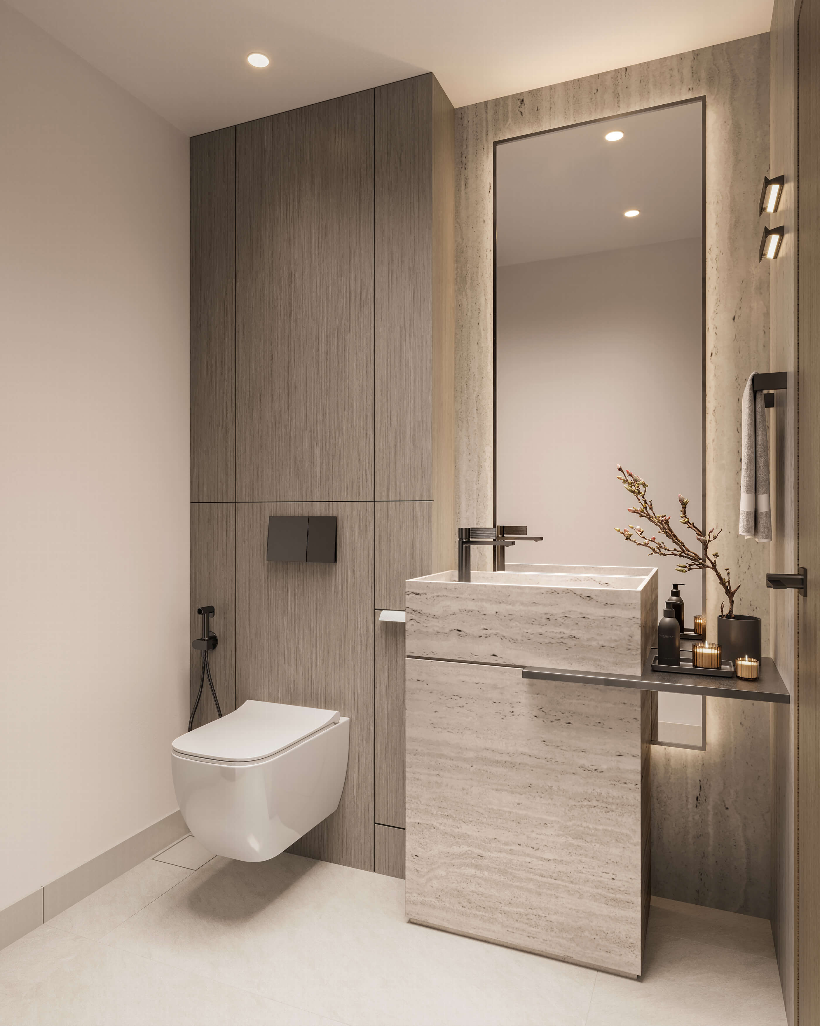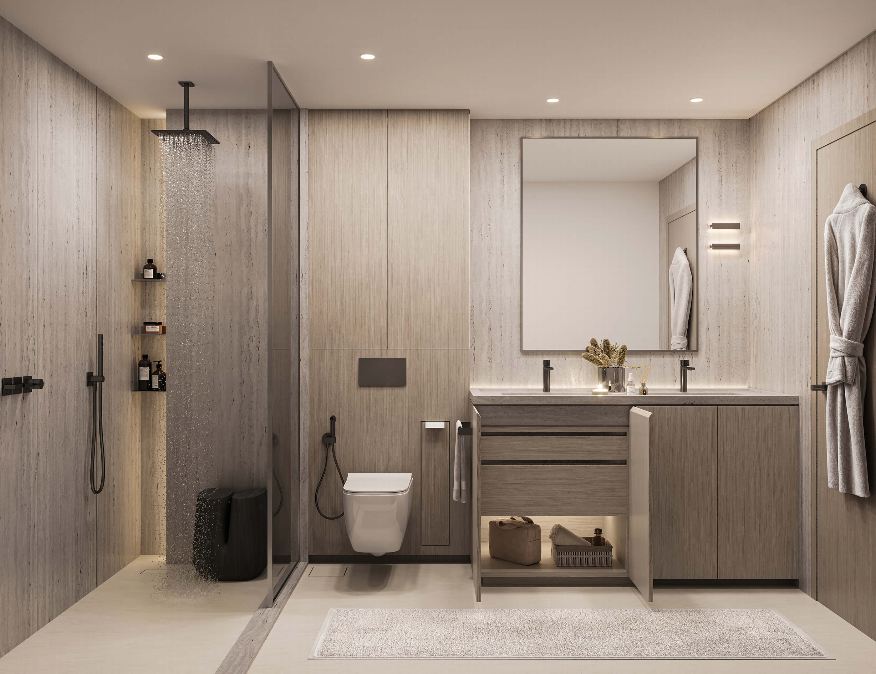 The spacious 1-, 2-, and 3-bedroom apartments and stylish penthouses are crafted with attention to detail, featuring light tones, natural materials, and large windows that flood the spaces with natural light, creating a serene and calming environment.